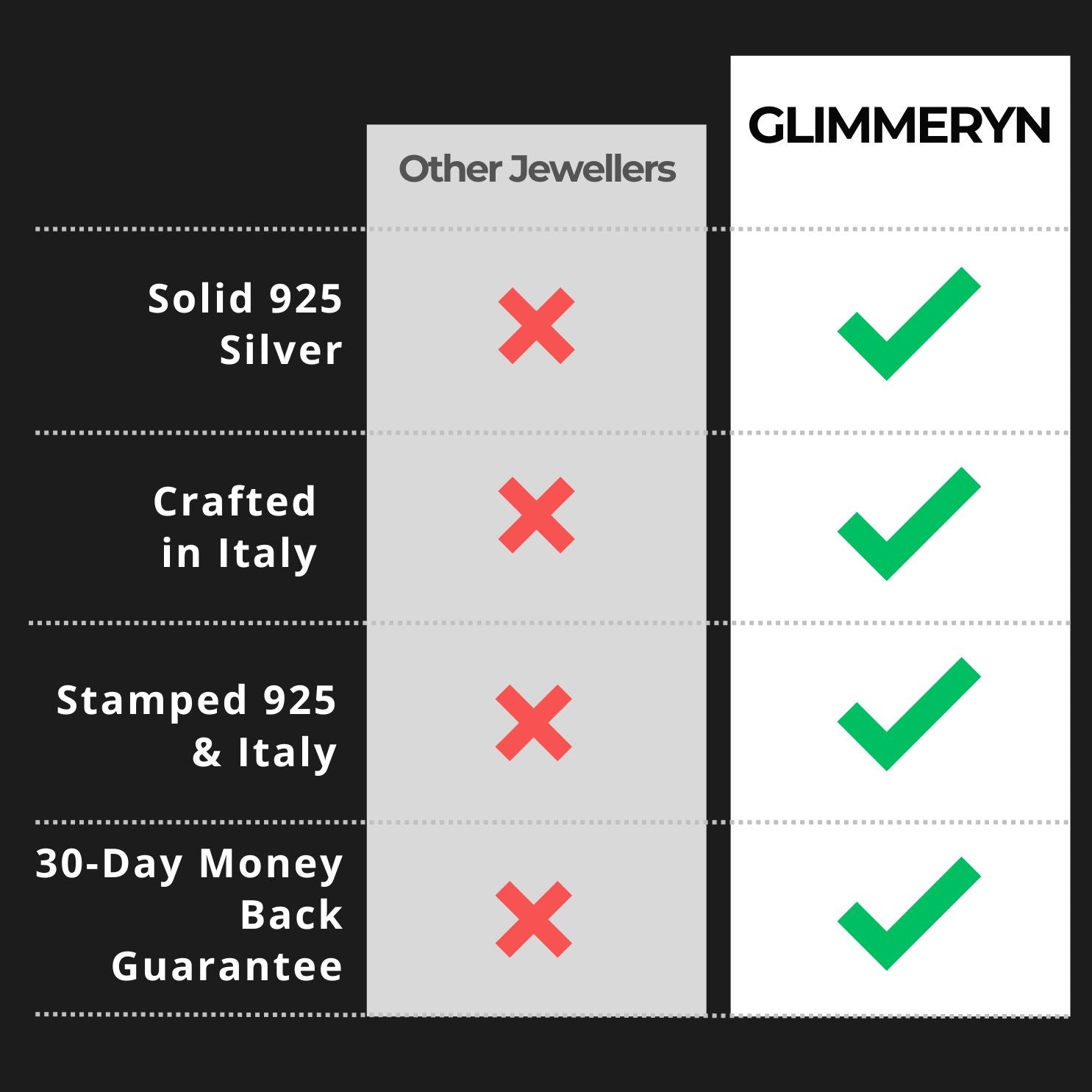 Skip the plated look. Glimmeryn chains are solid 925 silver, crafted in Italy, and hallmarked for authenticity. Designed with weight, shine, and lasting presence.